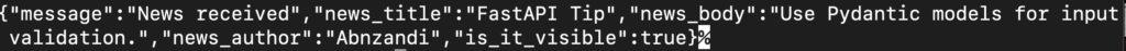 curl -X POST "http://127.0.0.1:8000/news/" -H "Content-Type: application/json" -d '{"title":"FastAPI Tip","body":"Use Pydantic models for input validation.","author":"Abnzandi","is_visible":true}'