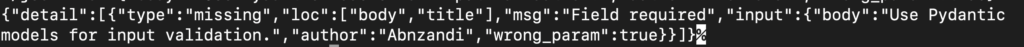 curl -X POST "http://127.0.0.1:8000/news/" -H "Content-Type: application/json" -d '{"body":"Use Pydantic models for input validation.","author":"Abnzandi","wrong_param":true}'