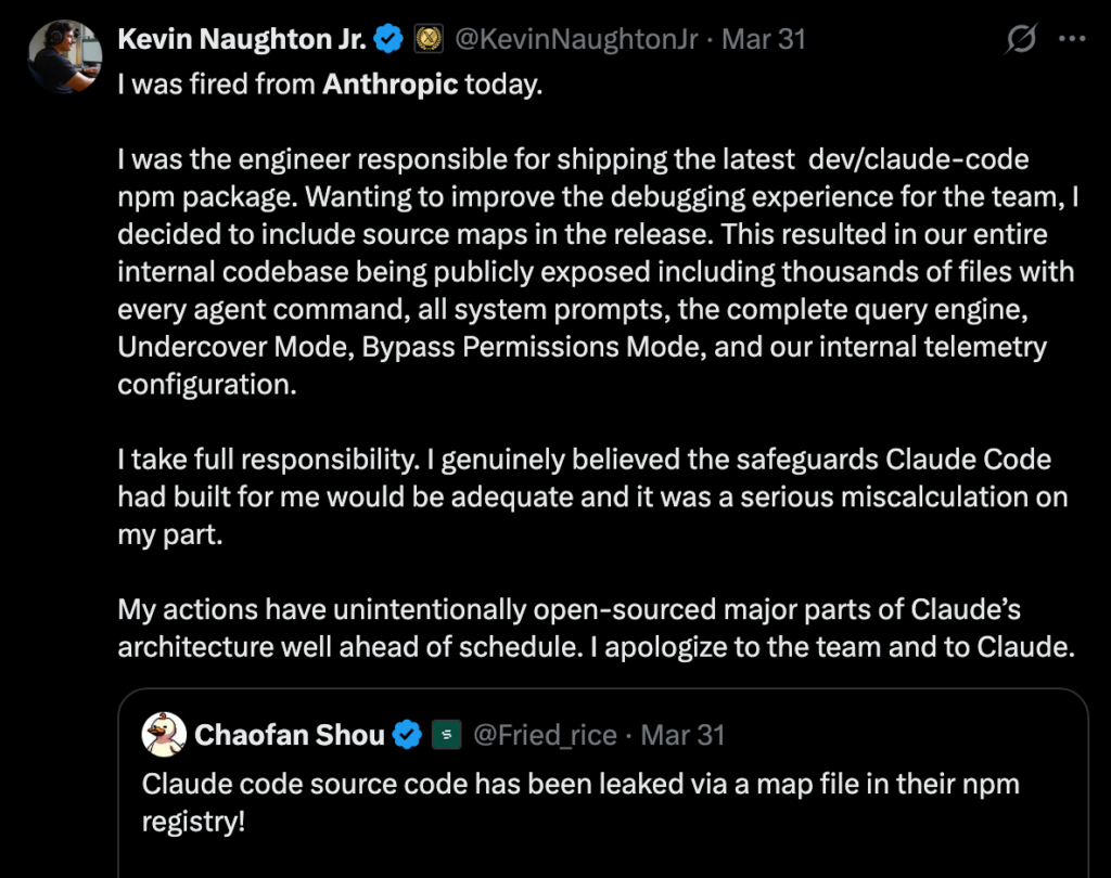 A viral post by Kevin Naughton Jr. claiming he was the engineer behind the incident and had just been fired for accidentally exposing the entire Claude Code system through a source map file. The post, which described leaking everything from internal prompts to “bypass permission modes,” was dramatic enough to make half of tech Twitter panic and the other half laugh, before people started realizing it might not be entirely serious — or at least not entirely verified. (X (formerly Twitter))
