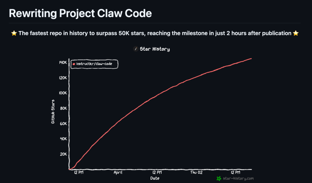 Within hours, a new repository called Claw Code appeared, not just mirroring the leaked system but attempting to rebuild and improve it, and it didn’t just go viral — it broke records. The repo became the fastest in GitHub history to surpass 100,000 stars, with developers rushing in not to archive the leak, but to rewrite the entire AI harness properly, this time in Rust, because apparently TypeScript trauma was not enough for one week.